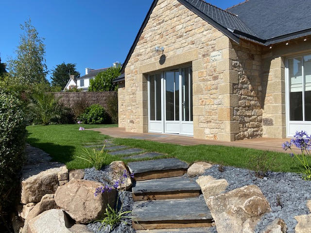 Réalisation d'une maison neuve de plain-pied reprenant les codes atypiques des anciennes habitations de la région (menuiserie bois, chevrons apparents...).